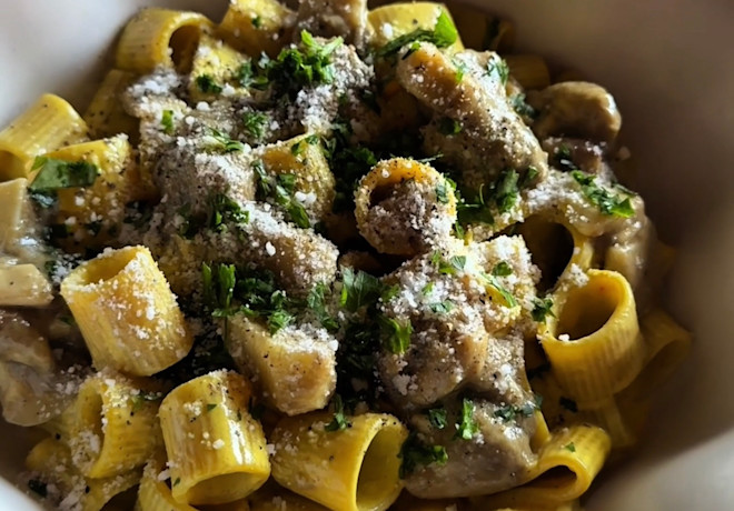 Pasta con crema di melanzane, pomodorini al forno e ceci